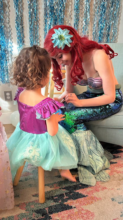 Our craft was to decorate and fill your own treasure box. This also served as our party favor. For our main party activity princess Ariel herself swam into our party to greet princess Lily and her merfolk friends. Ariel was so sweet and engaging! She sang several songs, danced with the kids and read them a princess story. This was such a special treat to have the princess of the sea greet us in person!